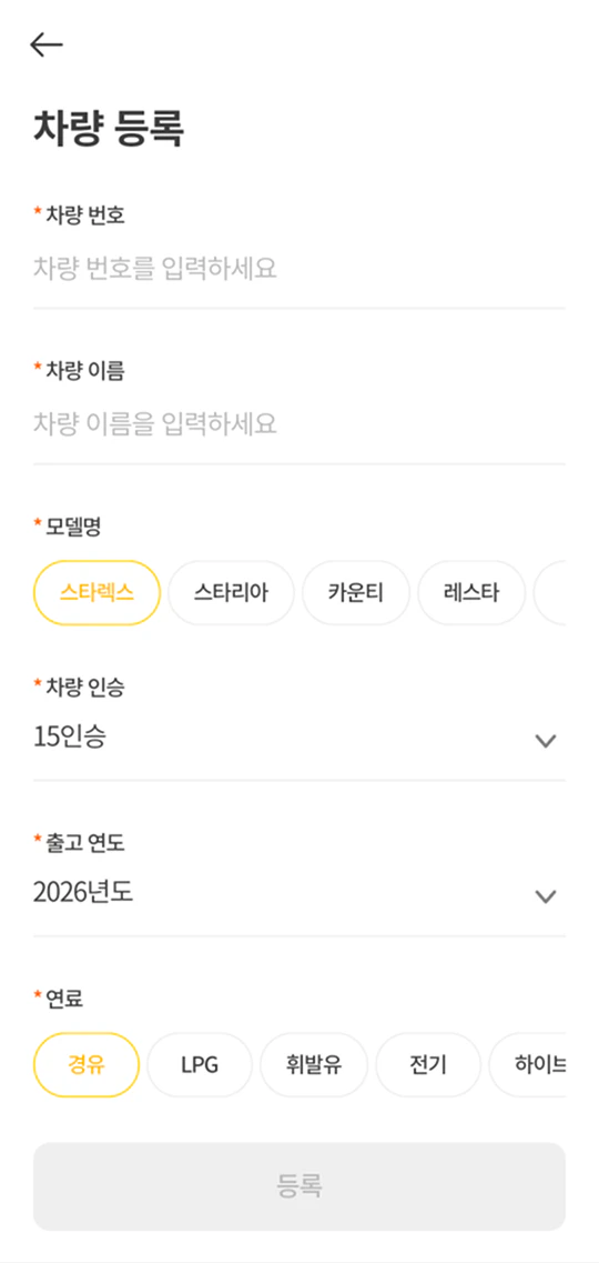앱 이용 가이드차량 등록차량 등록 차량 정보를 등록합니다. [메뉴 ≡] > [기관 정보 등록] 탭 > [차량] 선택 차량은 스케줄, 라이브, 일지 등 라이드 앱 내 전반적으로 사용됩니다.