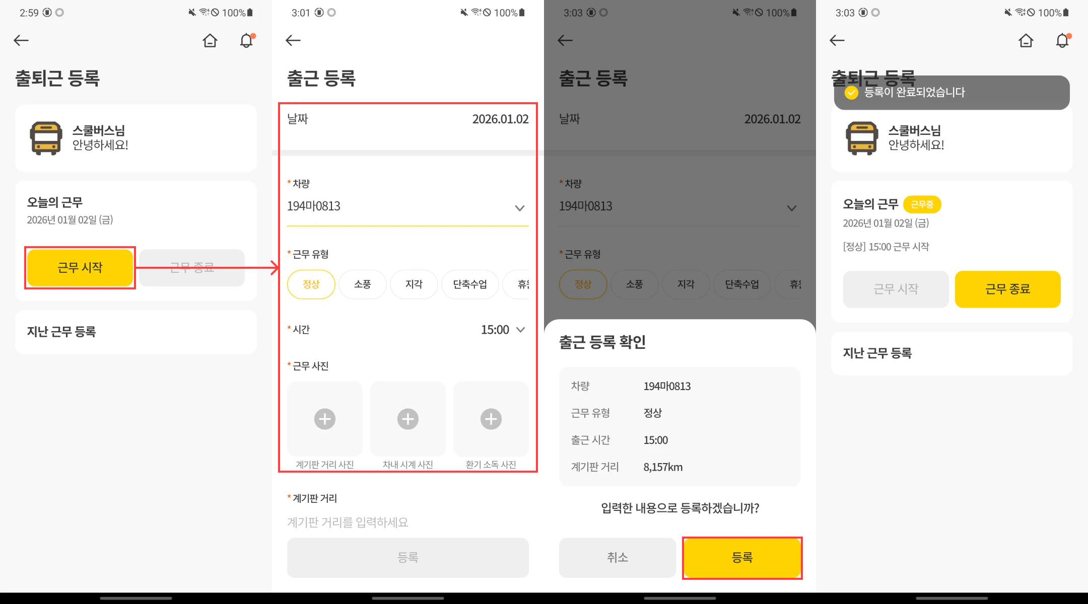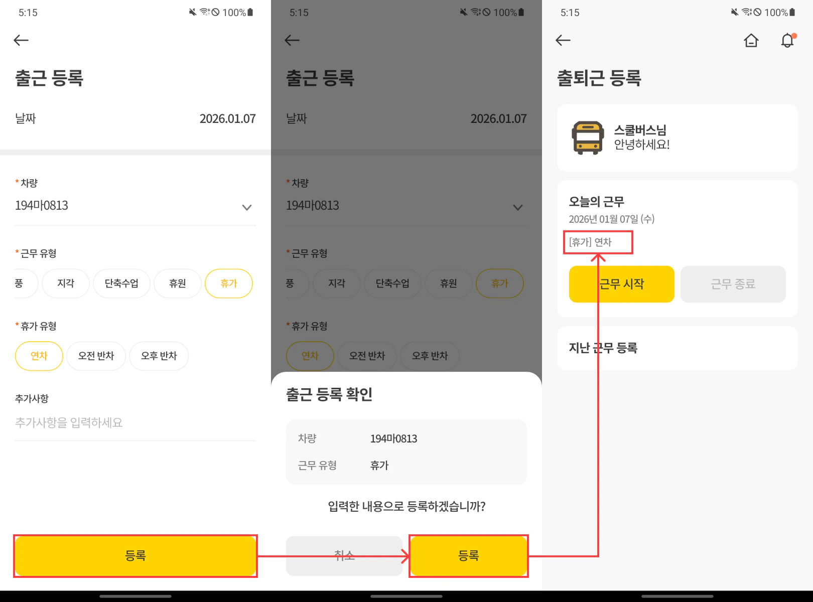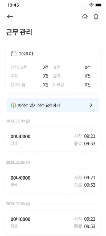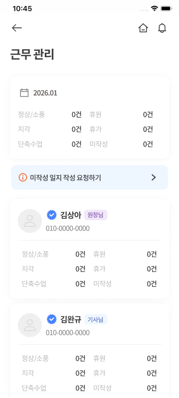 앱 이용 가이드근무 관리이 페이지에서근무 관리 출/퇴근을 기록하고 관리합니다. 출퇴근 등록 유형별로 (정상, 소풍, 지각, 단축수업, 휴원, 휴가) 근무 등록이 가능합니다. 출근 퇴근 지난 근무도 등록 가능합니다. 휴가 (연차) 휴가로 등록할 경우, 연차 집계에 반영될 수 있습니다. 근무 관리 구성원의 월별 근무 기록과 통계를 확인합니다.