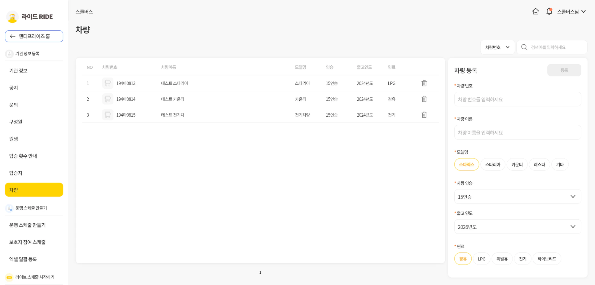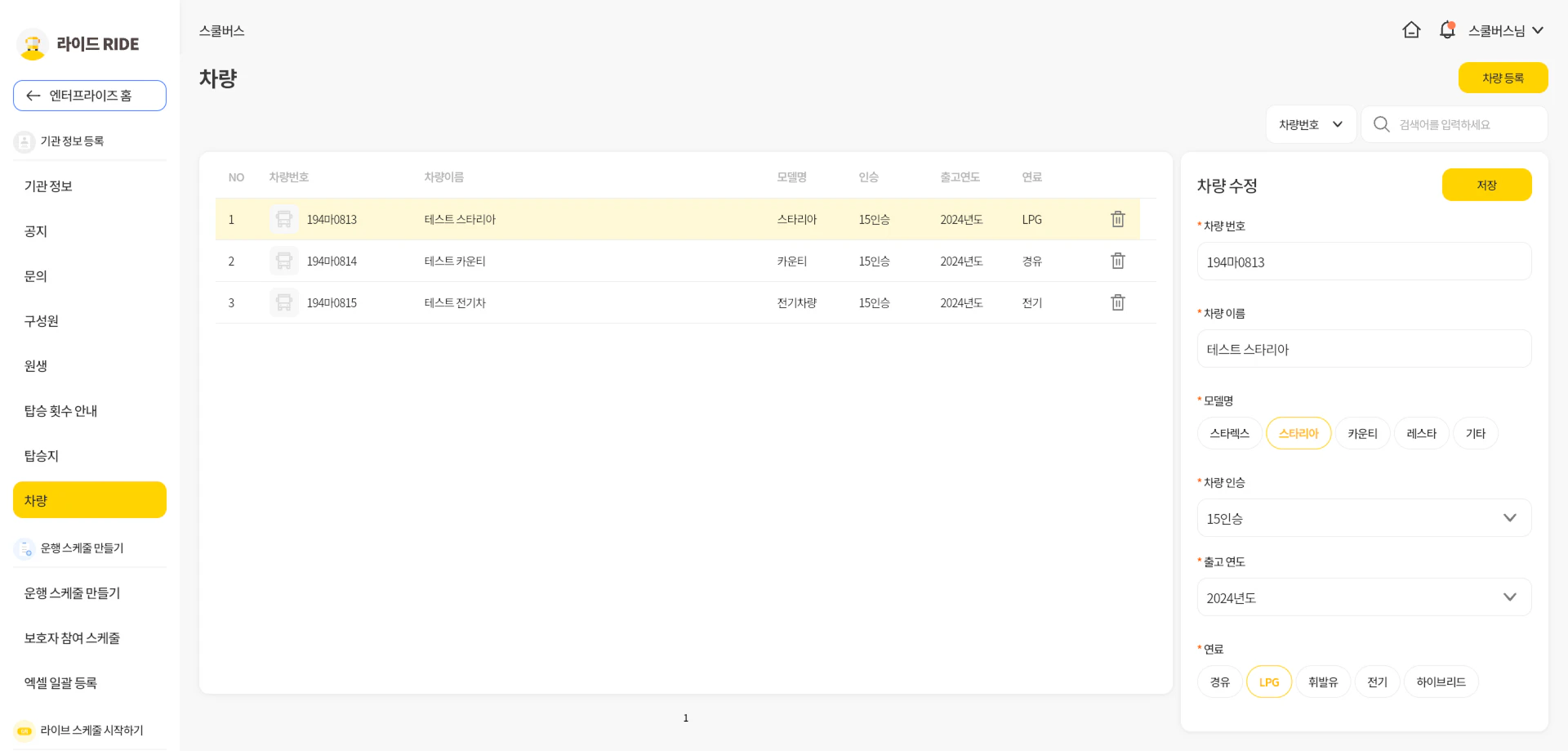 PC 이용 가이드차량이 페이지에서차량 차량 정보를 등록하고 관리합니다. 차량 등록 차량은 스케줄, 라이브, 일지 등 라이드 앱 내 전반적으로 사용됩니다. 해당하는 모델명이 없을 경우, [기타]를 선택 후 직접 입력 가능합니다. 차량 수정 목록에서 차량을 선택한 후, 정보를 수정하고 저장합니다. 등록으로 되돌아가시려면 상단 [차량 등록] 버튼을 눌러주세요.