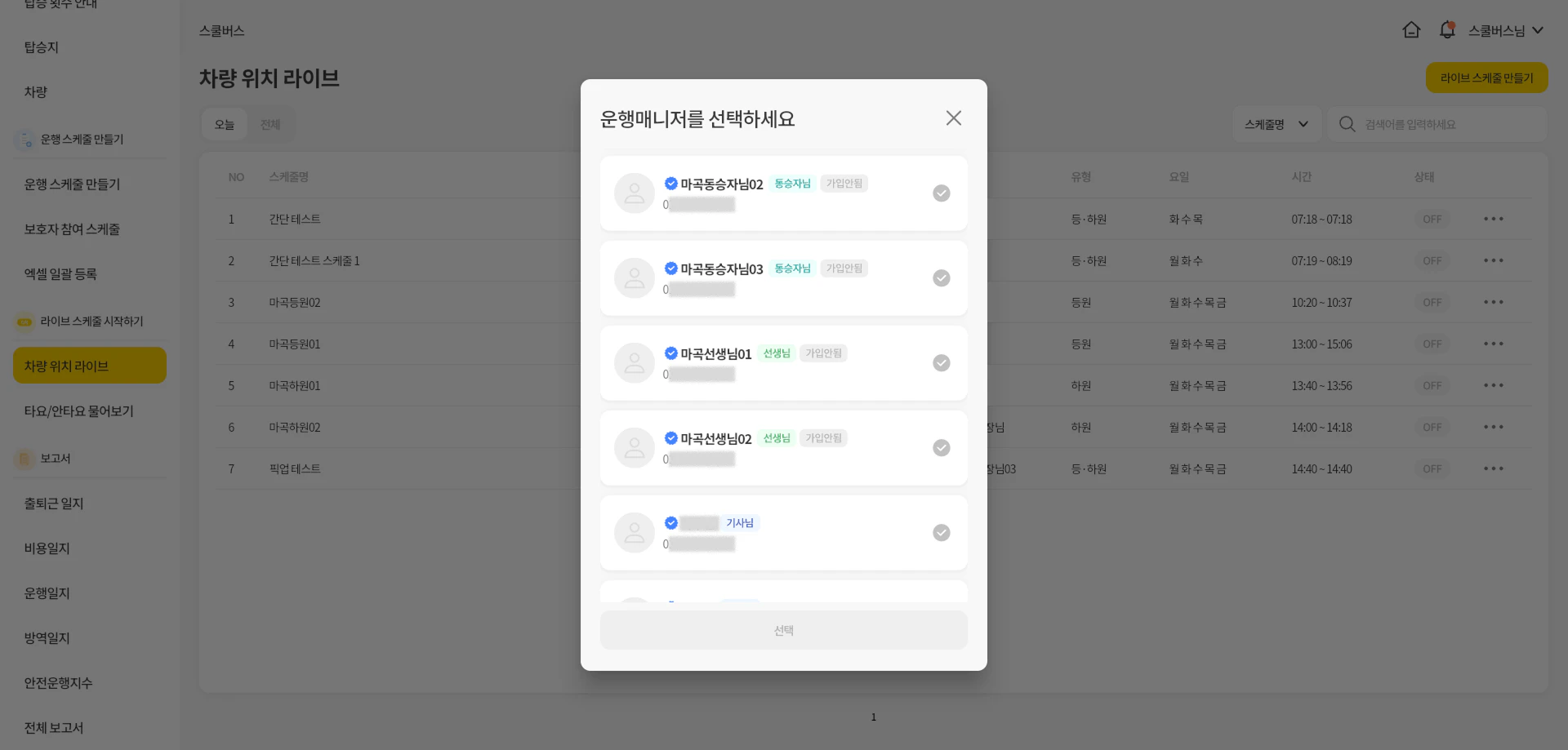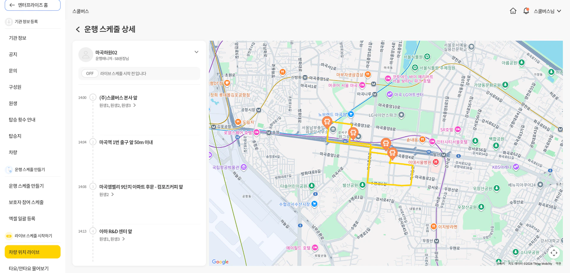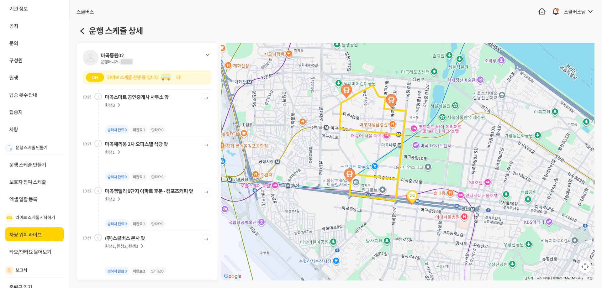 PC 이용 가이드차량 위치 라이브이 페이지에서차량 위치 라이브 기관의 구성원과 보호자에게 차량의 위치를 전송합니다. 라이브 등록 등록한 스케줄을 운행하기 위해서는 라이브 스케줄로 만들어야 합니다. 운행매니저와 스케줄을 연결해주세요. 스케줄 > [···] 버튼 > [운행매니저 지정] 선택 변경 시, 스케줄 > [···] 버튼 > [운행매니저 변경] 선택 해제 시, 스케줄 > [···] 버튼 > [운행매니저 해제] 선택 라이브 상세 라이브 스케줄을 선택하면 차량의 위치와 상세 정보를 확인할 수 있습니다.