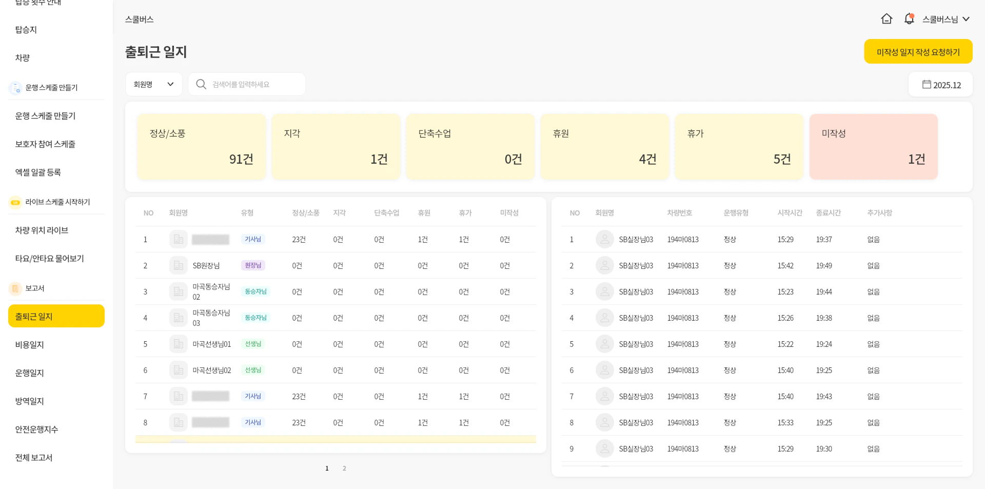 PC 이용 가이드근무 관리근무 관리 출/퇴근을 기록하고 관리합니다. 월별로 작성된 일지 내역을 상세히 확인할 수 있습니다. 상단 [미작성 일지 요청하기] 버튼을 눌러 구성원에게 일지 작성 요청 알림을 전송할 수 있습니다.